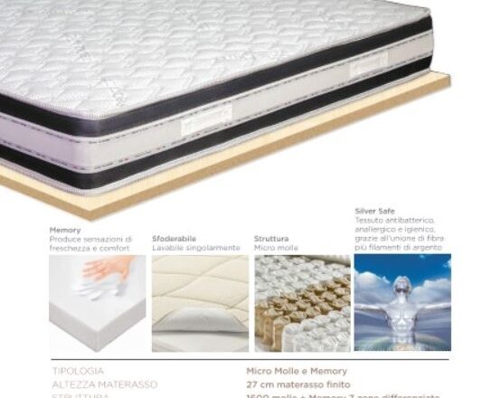 TIPOLOGIA: Micro Molle insacchettate e Memory ALTEZZA MATERASSO: 27cm finito STRUTTURA: 800 micro molle + Memory in 7 zone differenziate CARATTERISTICHE SANITARIE: Anallergico,